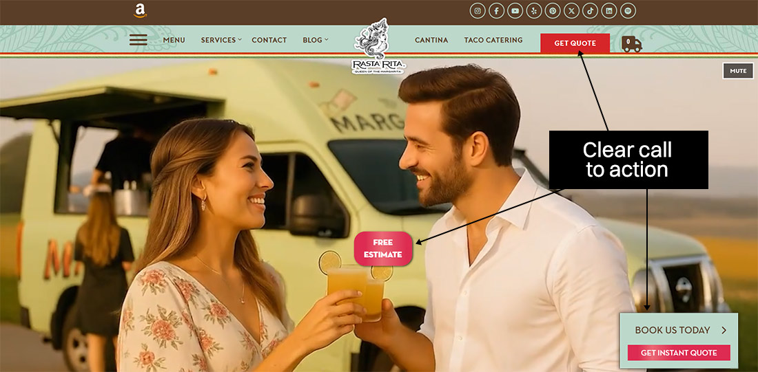 Example: Screenshot of the home page hero with call to actions taken from one of our client websites: Rasta Rita Margarita